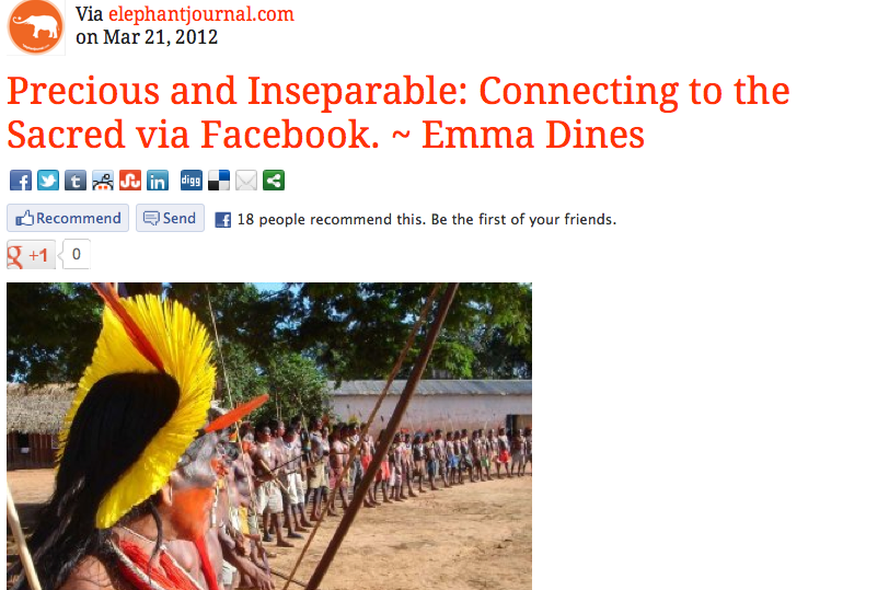 For those of you who were in my classes last week, you will remember that I was talking about a book called “Sacred Economics” and talking about what makes something sacred. A short piece that I wrote last week on this topic was published on the online newspaper Elephant Journal. It was calledPrecious and Inseparable: Connecting to the Sacred via Facebook“. You can click on the title to go to the article on the Elephant Journal site, or read the full post below.