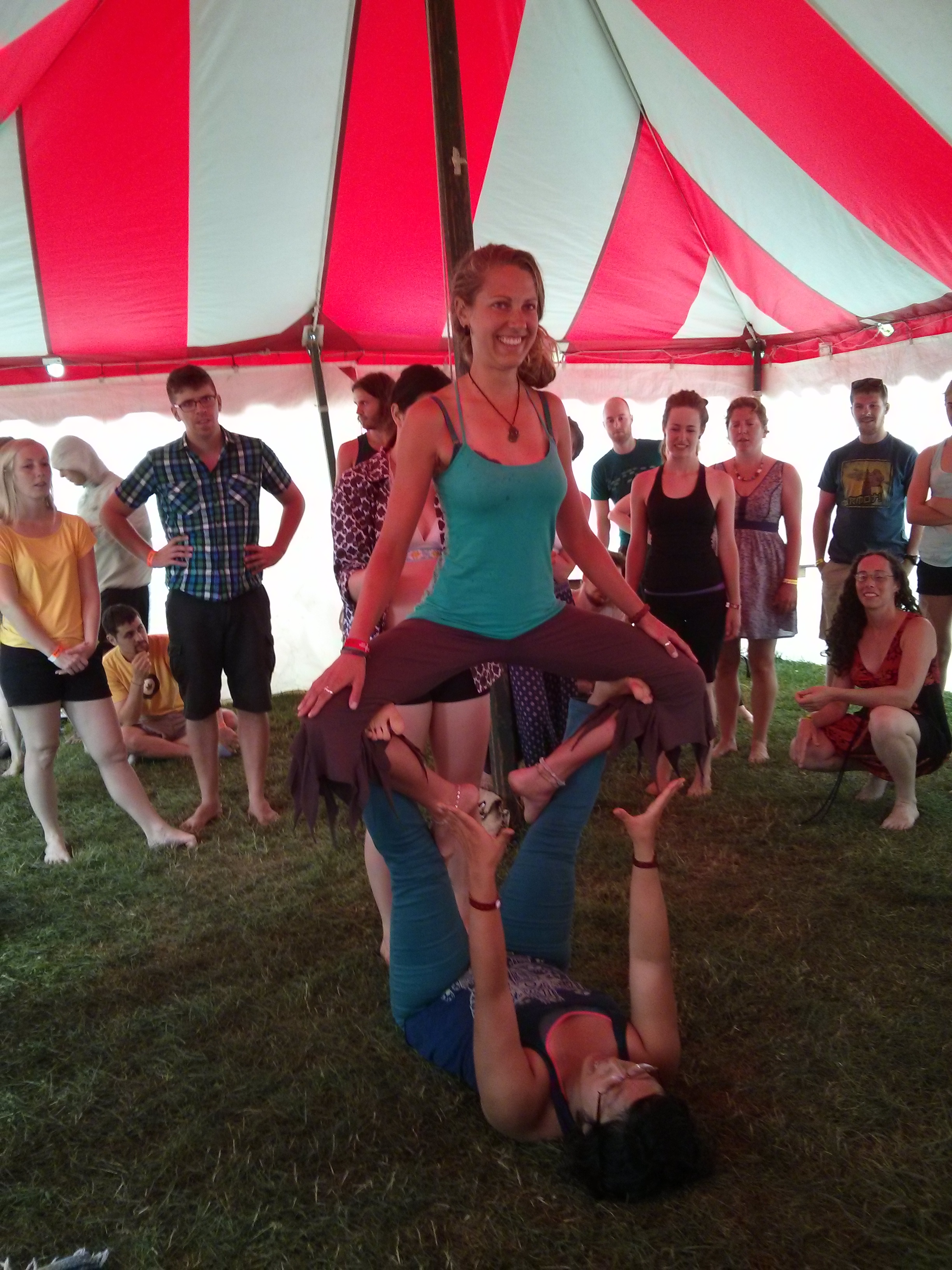 In March of this year, I began hatching my plan to offer a unique workshop at Hillside. Workshop spots are coveted by many people, as being selected to offer a workshop means a complimentary weekend pass and a chance to contribute to the magic of the festival. I had submitted workshop proposals a few years in a row (without success) but this year I felt like I had a royal flush. I submitted a proposal for Acrobatic Partner Yoga, and then sat back and waited. Plain old yoga workshops were a dime a dozen, but I hoped that I would be the only one submitting this particular workshop topic. In April, I got the good news. I had been selected! I worked on my workshop description and waited until July.