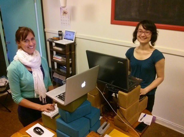 Many of us do. Many of us use computer stations or laptops that are not positioned well for us to maintain healthy posture. Andy, Leena and I have become aware of the effects of non-ergonomic computer use while we’re working away at the studio, and we’ve been experimenting with different ways of elevating our screens, keyboards and mice so that we can work in a more optimal position for our spines. Check out the various desk arrangements we’ve experimented with. We are lucky to have lots of yoga blocks around to play with! Over the course of the day, we alternate between standing and sitting desk arrangements. (Read more about the benefits of standing desks in this article). We also try to take regular stretch breaks (which sometimes turn into dance breaks in the front studio) to move our bodies and rest our eyes.