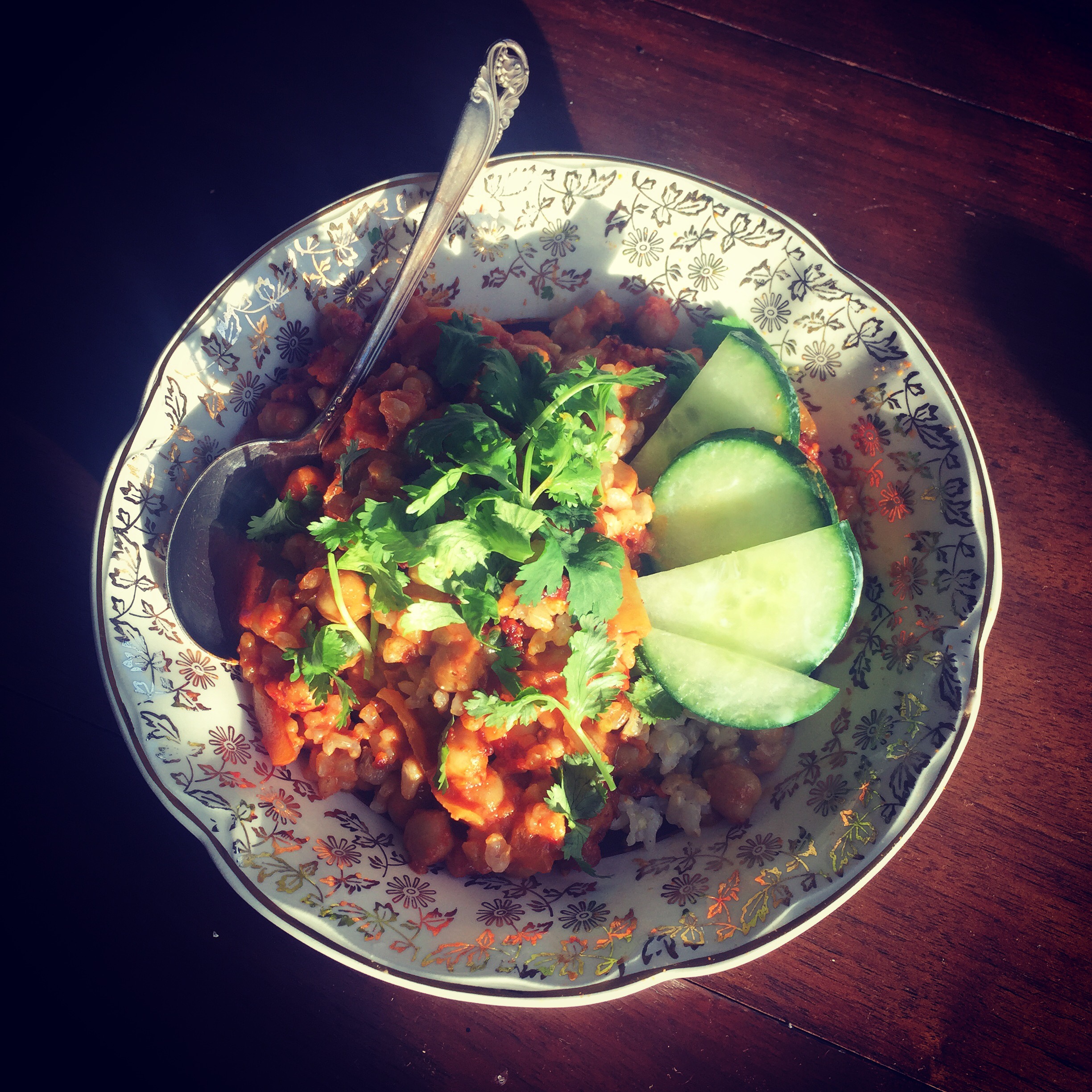 - I like to serve this curry over brown rice with a side of sliced cucumber and cilantro.