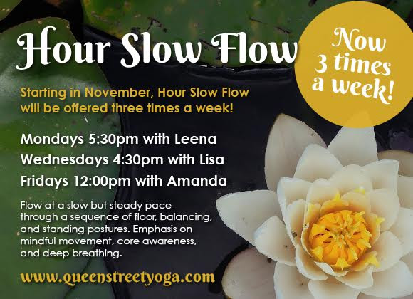 In addition to our popular Monday evening Slow Flow with Leena (which can be followed directly with Rest & Renew for a real treat!), we’ve added two new Slow Flow Classes to our November-December Schedule!