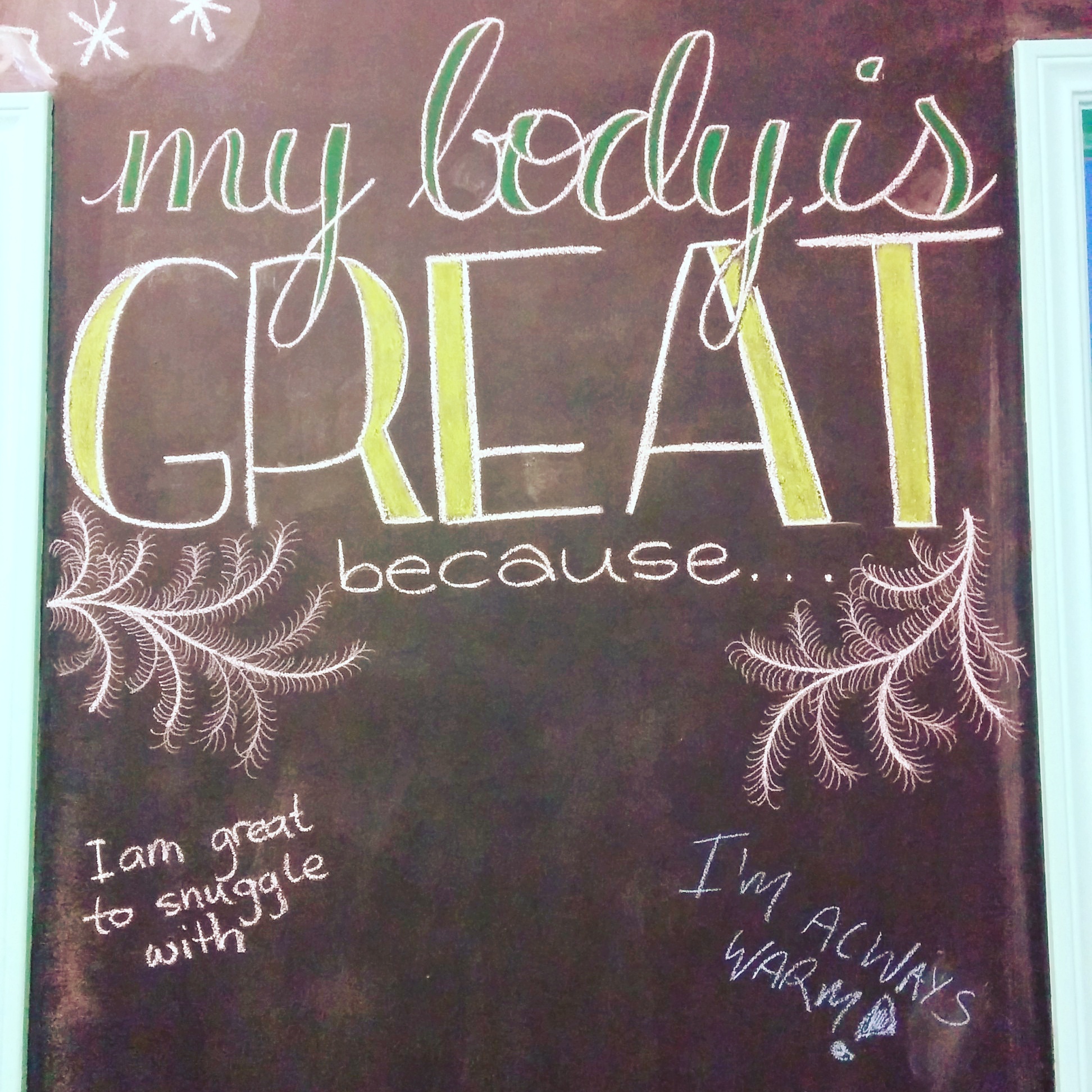 We invite you to add your body reflection to the chalkboard at the studio! We truly believe all bodies are great: growing bodies and aging bodies, female bodies and male bodies and queer bodies, tall bodies and short bodies, disabled bodies, thin bodies, round bodies, injured bodies, athletic bodies, our bodies. Tell us what’s great about your body!