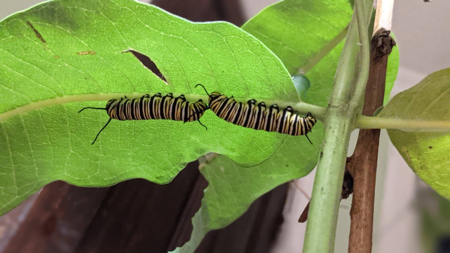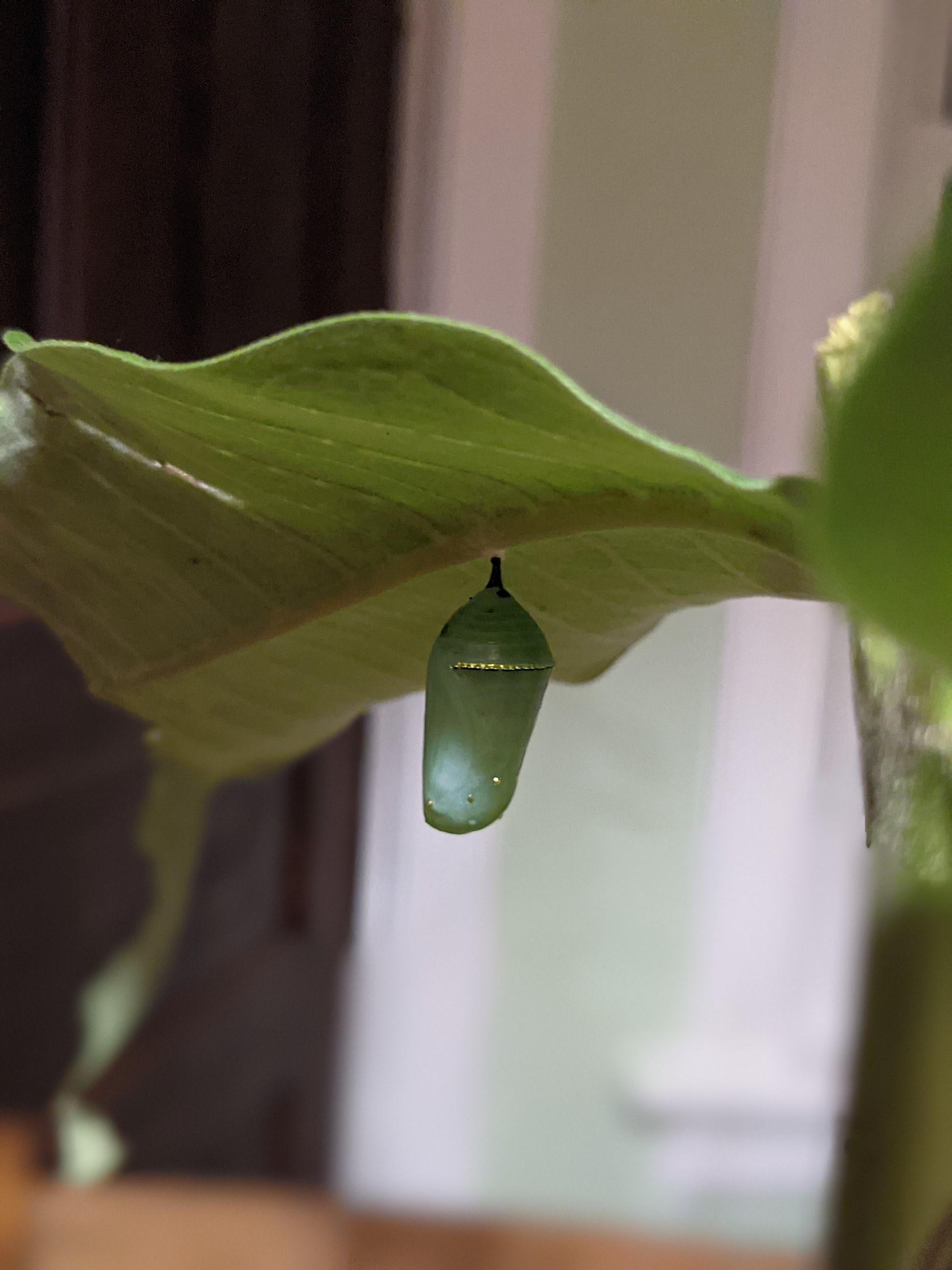 In the wild, only 10% of monarch caterpillars normally survive to reproduce, and those rates are decreasing due to pesticide use and climate change. Inside, all but one has survived so far. Once the butterflies emerge, I’ll release them to my garden.